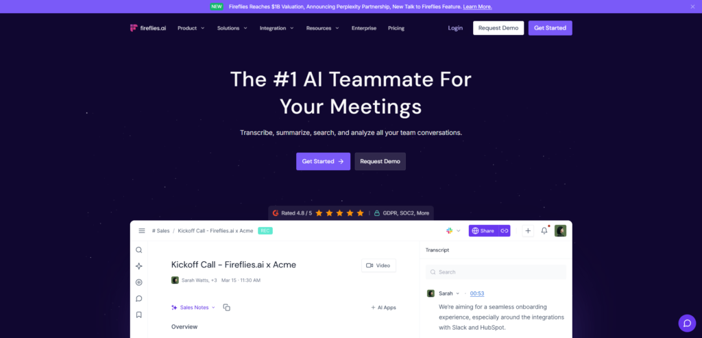 - Real‑time transcription and summaries – Fireflies records meetings and produces both raw transcripts and concise summaries.