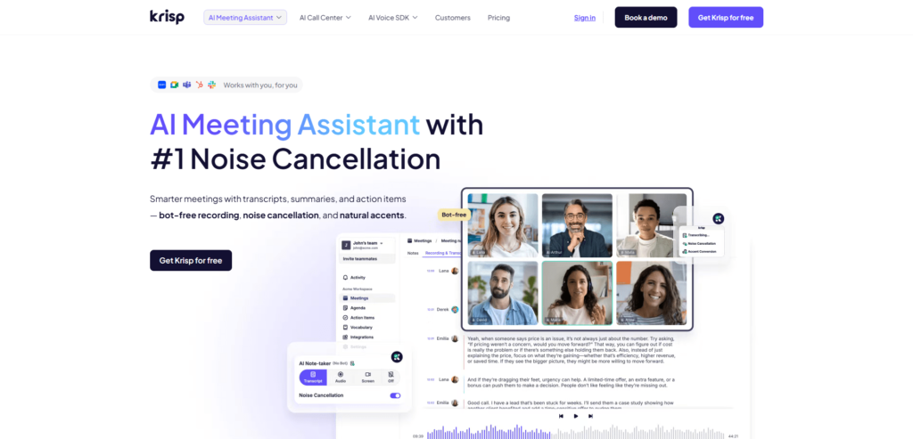 Professionals working in noisy environments (home offices, co‑working spaces), collaborating across accents, and anyone needing clean audio plus note‑taking. Krisp’s noise cancellation and accent conversion make transcripts more accurate.