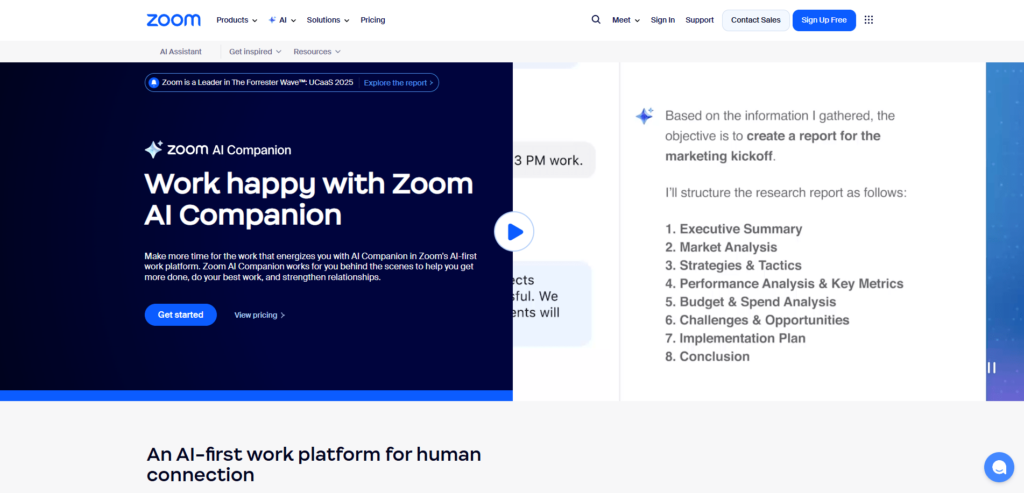 - Integrations – connects with Zoom, Microsoft Teams, Slack, Salesforce, Notion, and Zapier.
