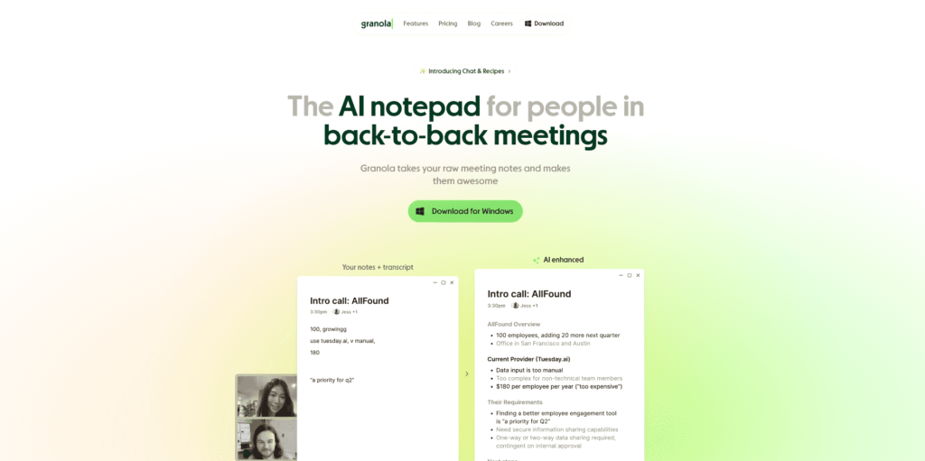 - AI summaries – generate structured notes with action items and speaker labels and allows users to enhance notes after meetings.