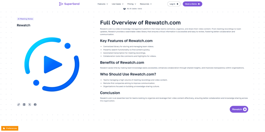Teams that create a lot of video content and need to manage recordings centrally. Rewatch is great for product demos, training sessions, and customer webinars.