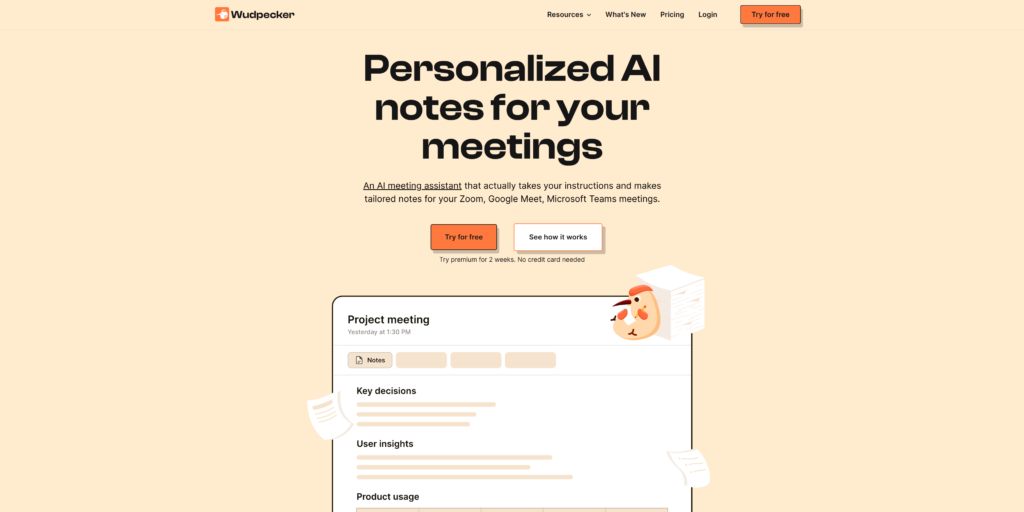Wudpecker is described as a simple AI meeting assistant with transcription support for over 100 languages and customizable note‑taking templates. It integrates with Zoom, Google Meet and Microsoft Teams and offers one‑click meeting recording and transcription. Wudpecker’s straightforward interface makes it easy for multilingual teams to adopt.